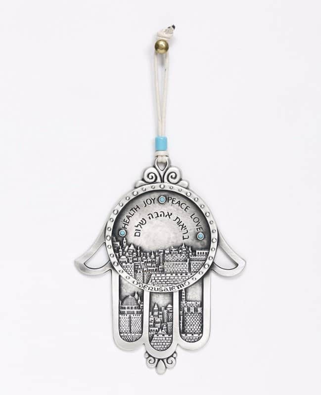 מתלה חמסה מצופה כסף טהור, מעוטרת בגוף החמסה ובשלוש האצבעות האמצעיות בתבליט מראות ירושלים היפה.