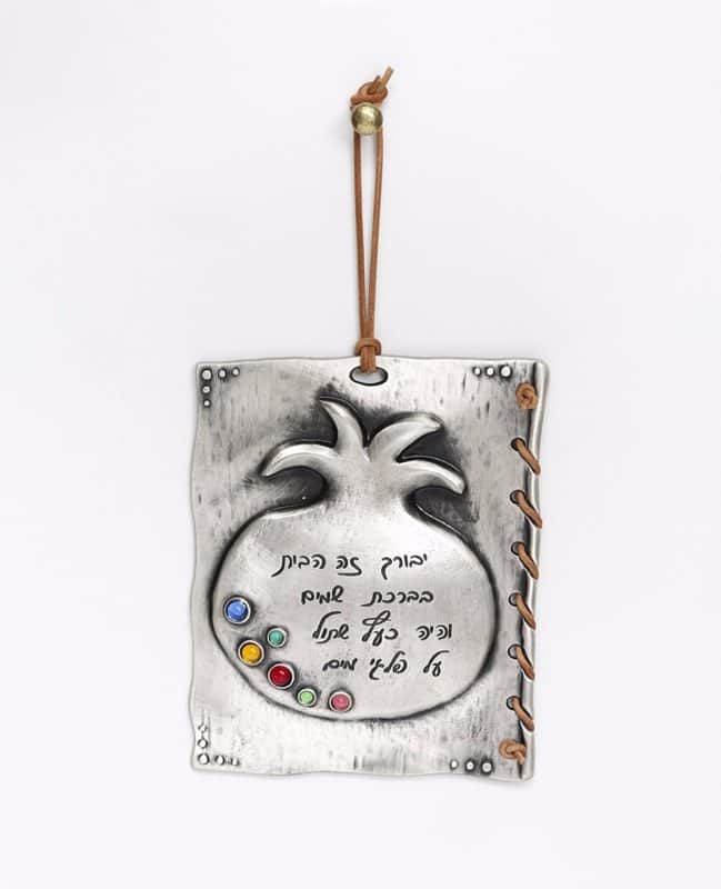 מתלה ברכת הבית מדהים ביופיו בצורת פלטה, שעליה תבליט בצורת רימון ובהיקפה שזור שרוך דמוי עור. המתלה מצופה כסף טהור ומשובץ באבנים צבעוניות.