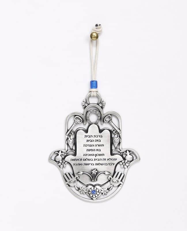 מתלה חמסה ברכת הבית בעיצוב ייחודי ומרשים, מעוטר במוטיבים של מפתח, דג, פרסה ורימון, שעל פי היהדות מסמלים דרך חדשה, פוריות, מזל ושפע.