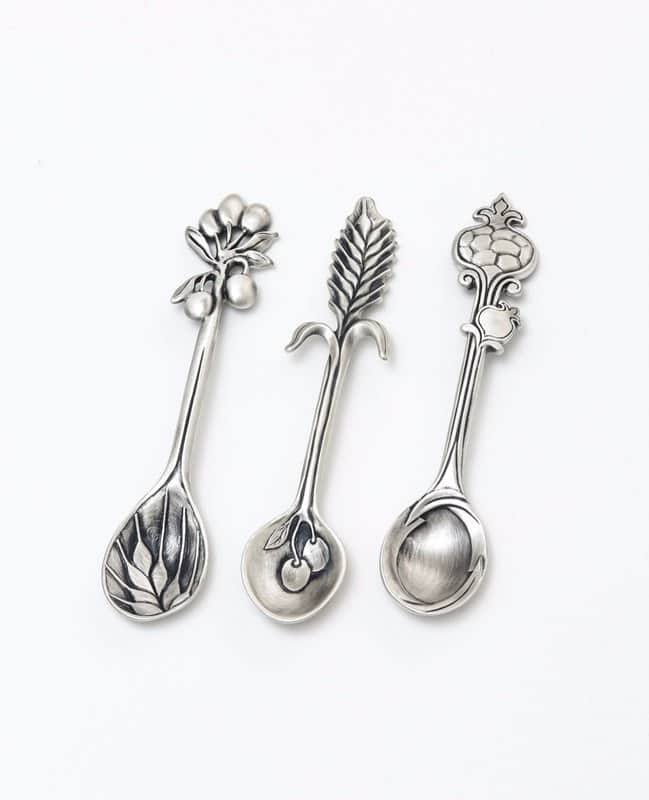 מארז מקסים המכיל שלוש כפיות נוי מצופות כסף טהור ומעוטרות במוטיבים מתוך שבעת המינים.