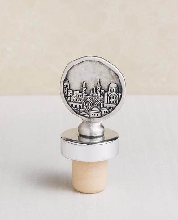 פקק שעם לבקבוק יין עם עיטור עגול מצופה כסף טהור ועליו תבליט ירושלים העתיקה.