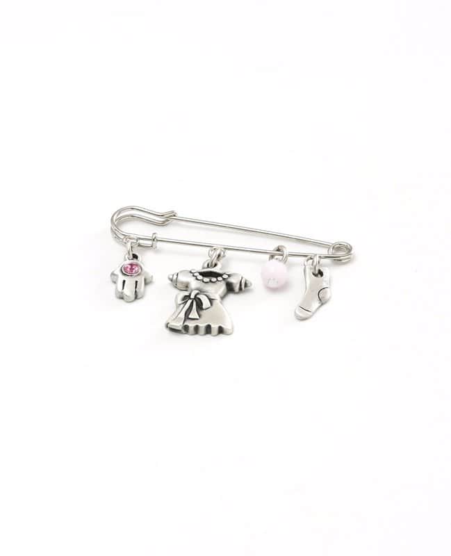 תליון עגלה בצורת שמלה מתוקה מצופה כסף טהור ואליה מצורפים חמסה עם אבן ורודה, גרב קטנטנה וחרוז לבן.