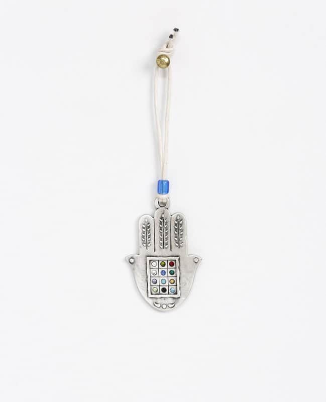 המתלה מעוצב כחמסה מרהיבה, שבצידה האחד תבליט החושן משובץ באבנים צבעוניות ומעליו עטורי ענפים.