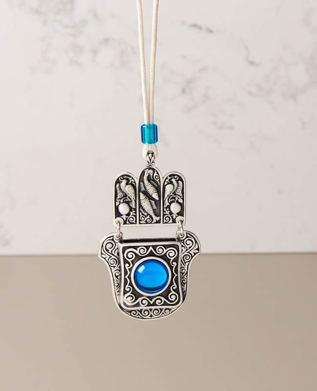 המתלה מצופה כסף טהור ותלוי על חוט דמוי עור בצבע טבעי, המעוטר בחרוז כחול.
