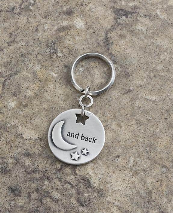 המחזיק מעוצב כעיגול שמצדו האחד הטבעה של ירח בצבע פליז ועליו כתוב Love you to the moon