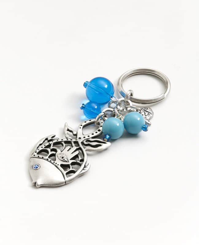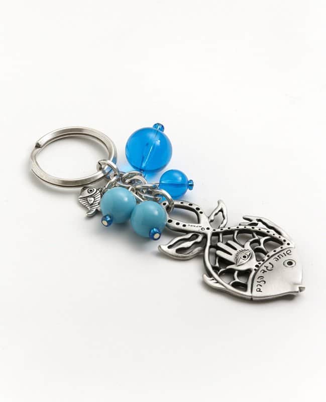 מחזיק מפתחות שבמרכזו אלמנט הדג, אחד מסמלי השפע והמזל, בחיתוך אומנותי משולב חמסה ומצופה כסף טהור, סביבו "טיפות" חרוזים צבעוניים בהשראת ים האפשרויות האינסופיות.