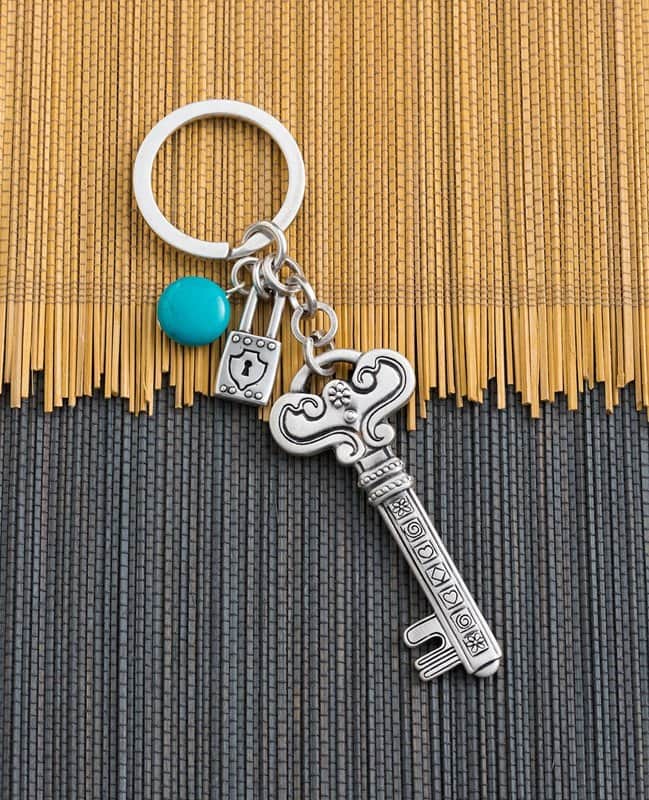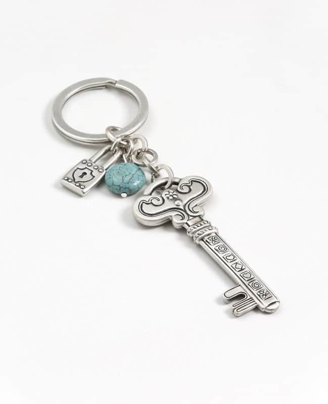 אל ראש המפתח מחוברת שרשרת משולבת שעליה תלויים מנעול קטן ואבן טורקיז יפהפייה.