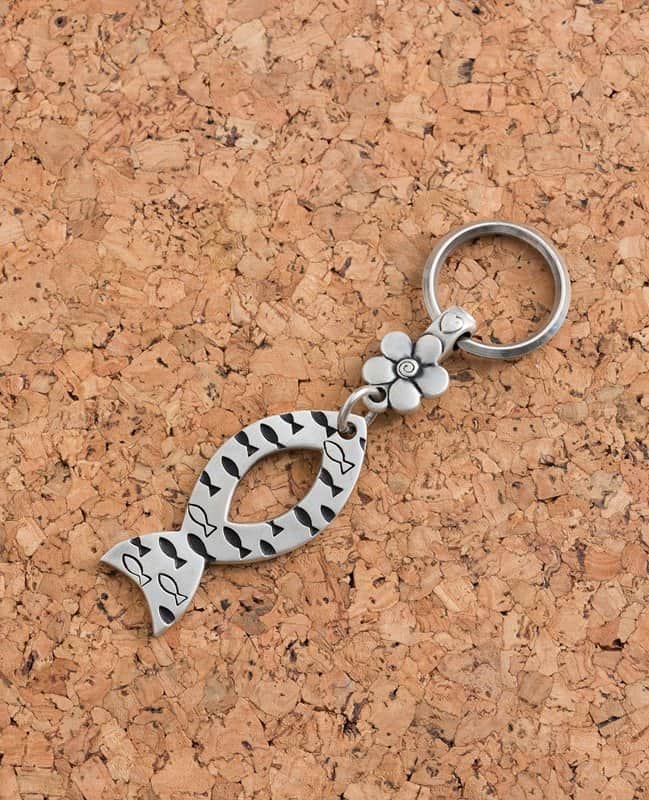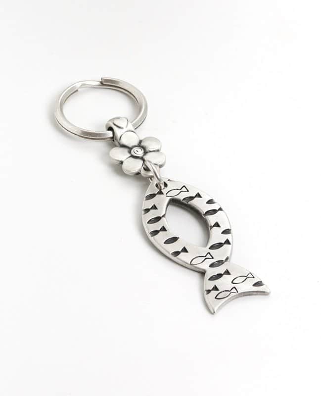 מחזיק מפתחות בעיצוב מקורי ומרשים, מצופה כסף טהור, בצורת דג ופרח.