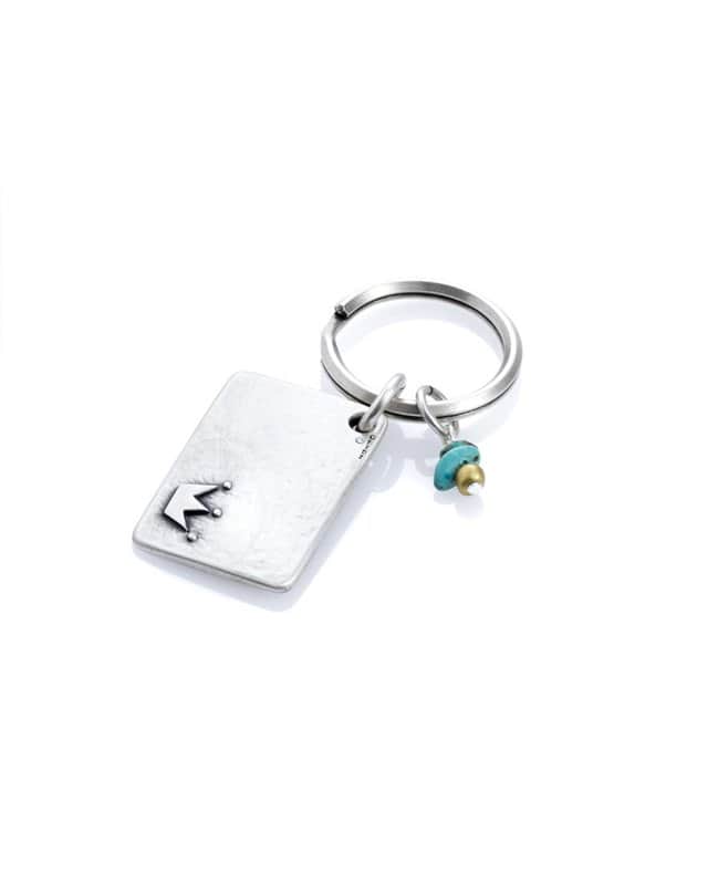 לצד המלבן תלויים שני חרוזים בצבע טורקיז וחרוז בצבע זהב.