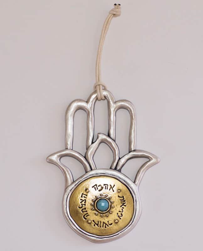 מתלה חמסה בעיצוב מדהים ביופיו: חמסה חלולה עם מרכז מצופה פליז ובשיבוץ אבן טבעית בצבע אופל.