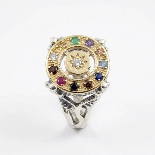 טבעת כסף בשילוב זהב משובצת ב-12 אבני החושן (כולל יהלום) בצדדים עיטורי ענפים ועלים