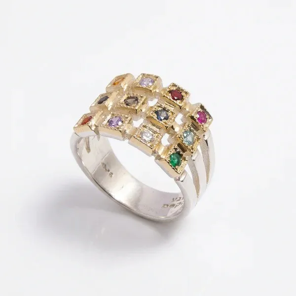 טבעת כסף בשילוב פלטת זהב 9K משובצת ב-12 אבני החושן, בשיבוץ אבני חן טבעיות (כולל יהלום)