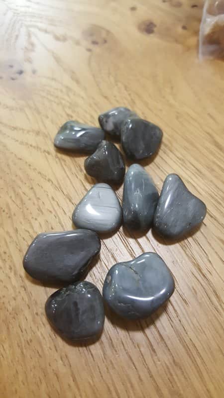 בתמונה, אבני קוורץ עם תופעת עין החתול אשר הפס בהם לא חד ולכן לוטשו בצורת חלוק נחל ולא כקבושון. היתרון - במחיר הנמוך משמעותית מאלו עם הפס החד