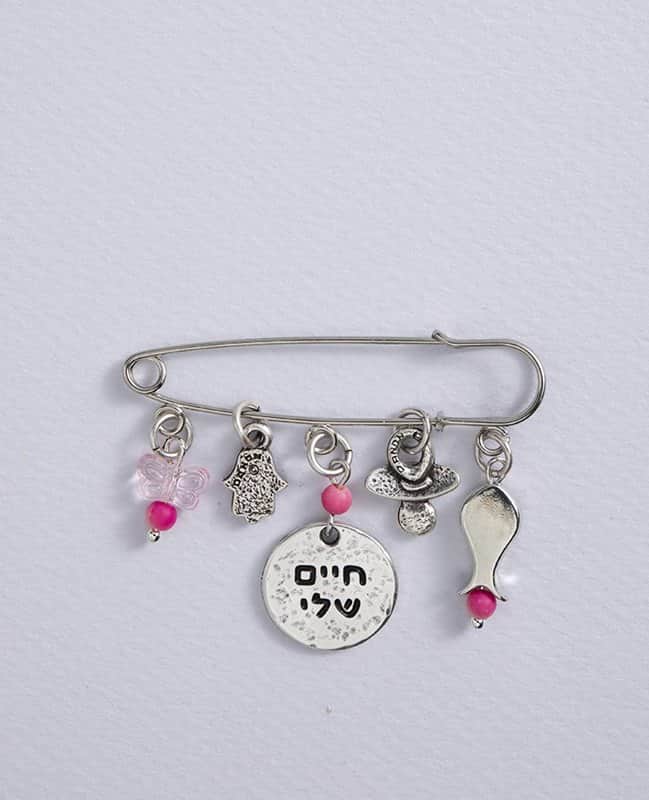 סיכה עדינה, מצופה כסף טהור ומעוטרת בשלל תליונים: חמסה לשמירה ולהגנה מפני עין הרע, דג לברכה, שפע ופיריון, תליון עליו חרוטות המילה "אמא" מצד אחד ו"חיים שלי" מהצד השני, תליון מוצץ ותליון פרח/פרפר - כל אלה יחד יוצרים שילוב מיוחד במינו, שכל אמא טרייה תשמח לקבל!