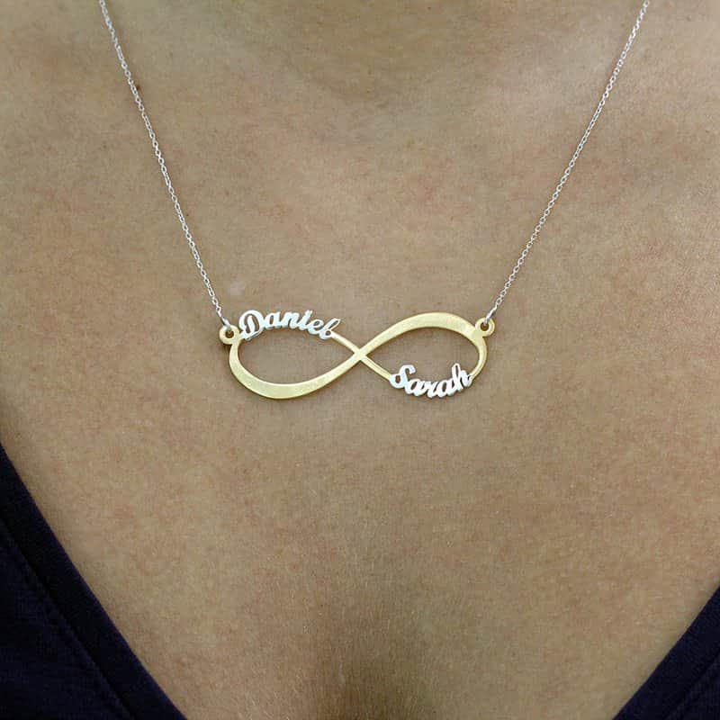 צורת אינפיניטי מושלמת שעליה משתלבים שני שמות בעיצוב אישי יוצרת את המתנה המושלמת לאהובה עליך או עבור עצמך!