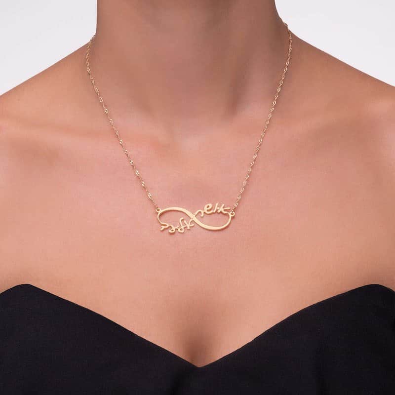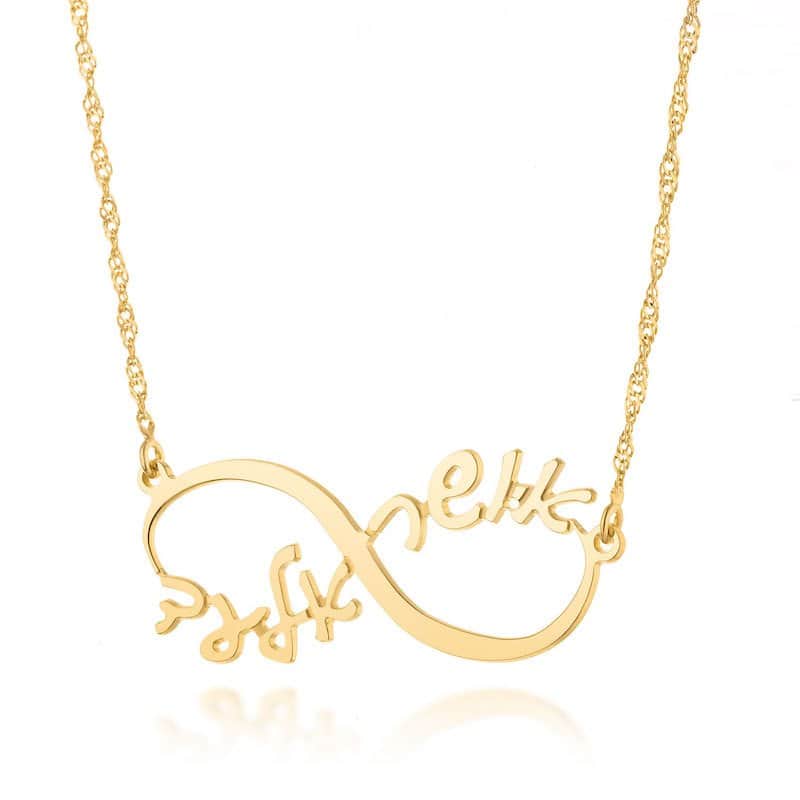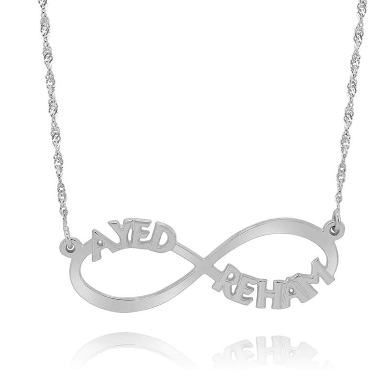 צורת אינפיניטי מושלמת שעליה משתלבים שני שמות בעיצוב אישי יוצרת את המתנה המושלמת לאהובה עליך או עבור עצמך!