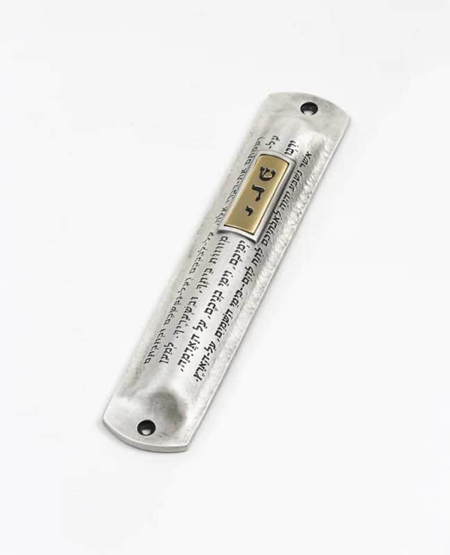 המזוזה מצופה כסף טהור ובמרכזה תבליט מלבני מצופה זהב, שעליו כיתוב המילה "שדי".