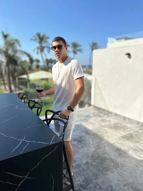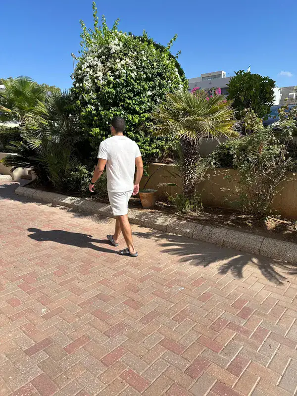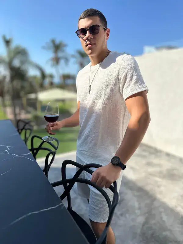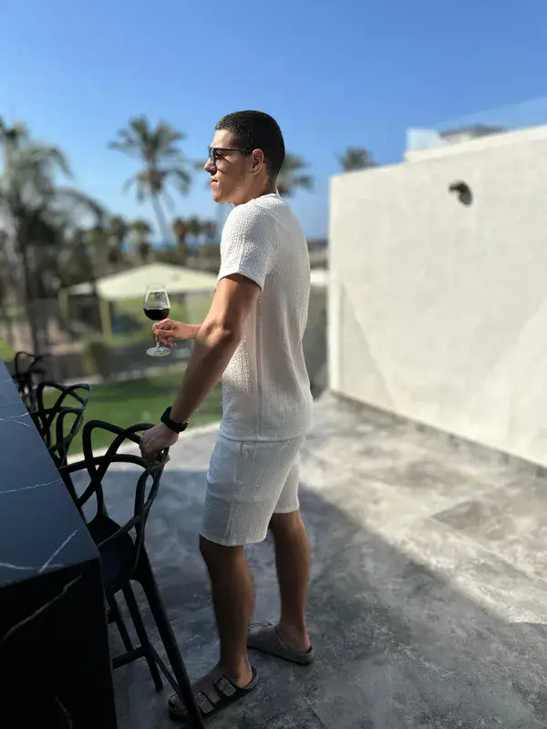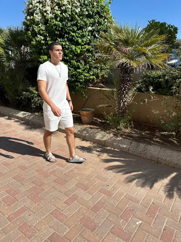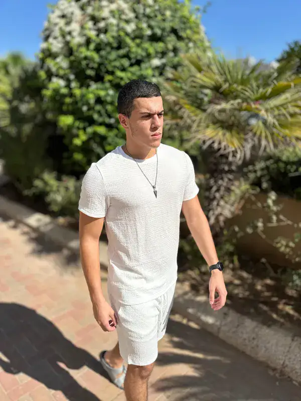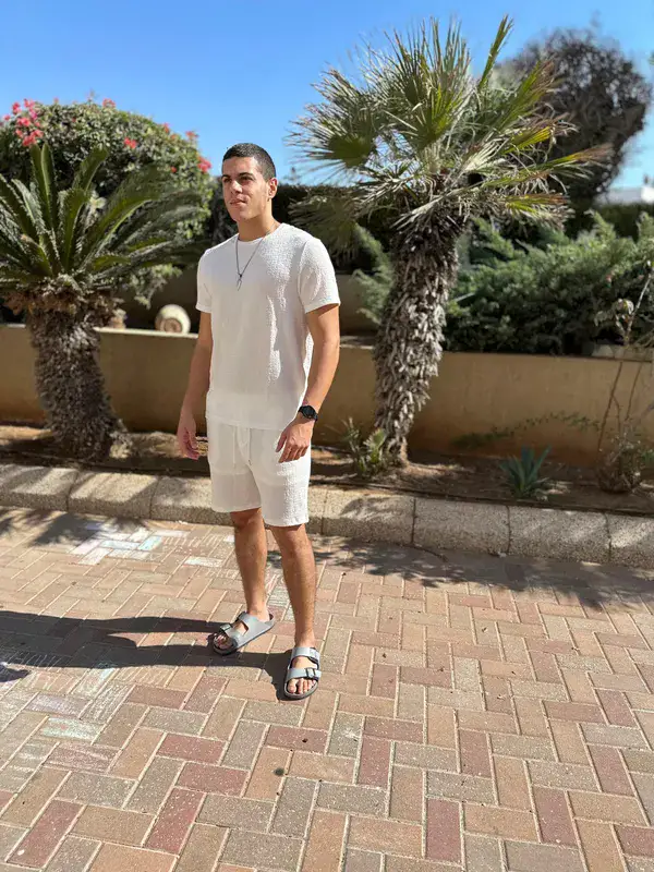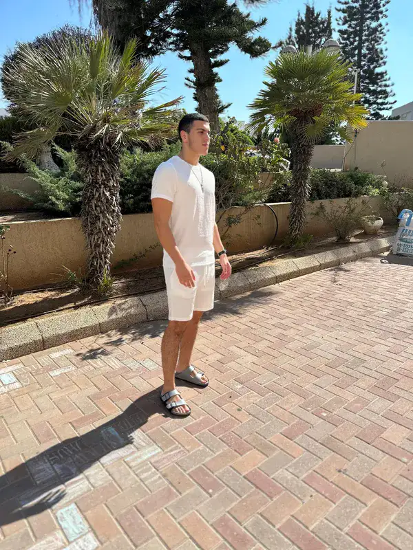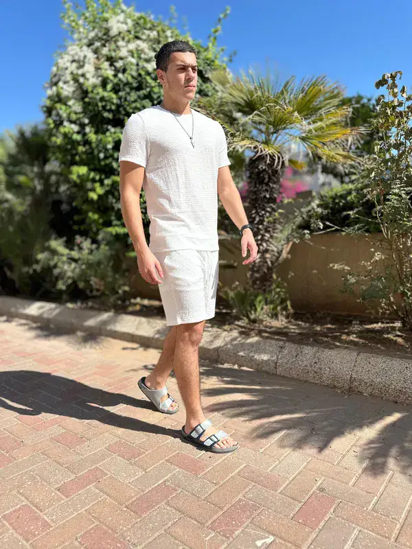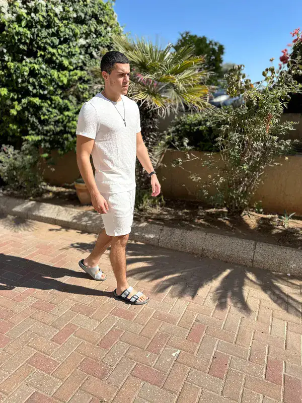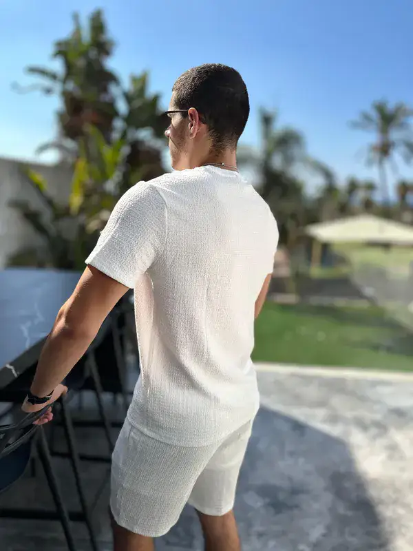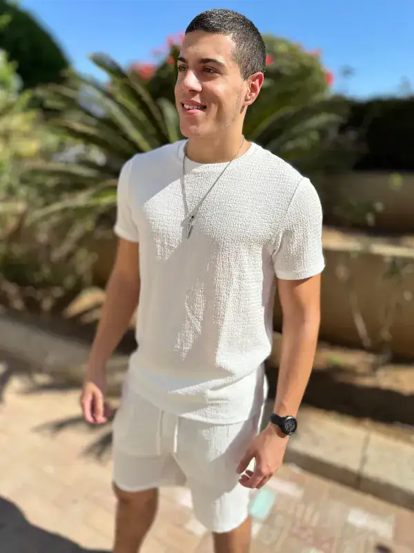 סט "לירוי" - חליפה (2 חלקים) קצרה סרוגה בצבע לבן אחיד פשוט לגברים בסגנון קז'ואל