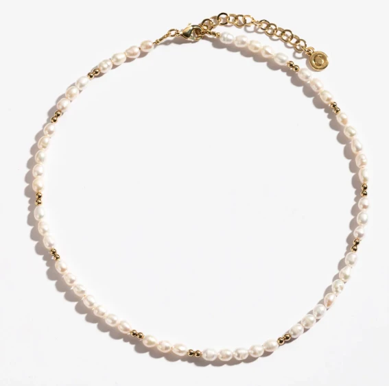 שרשרת פנינים טבעיות משולבת חרוזי מתכת עדינים, בעיצוב קלאסי ומחמיא. השרשרת עשויה בעבודת יד ומצופה בזהב 24K.