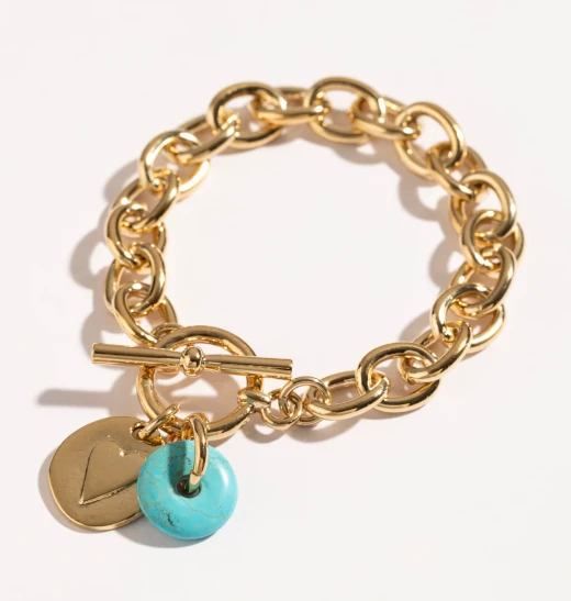 צמיד צ'אנקי, מצופה זהב 24 קראט, עשוי חוליות אובליות גדולות וסוגר טי, שעליו תליון עגול עם ציור לב והכיתוב "Love" מוטבע מאחור וכן גלגל טורקיז, שמעניק לו עוד טאצ' של צבעוניות וגם נחשב כצבע בעל סגולות לשמירה ולהגנה מפני עין הרע.
