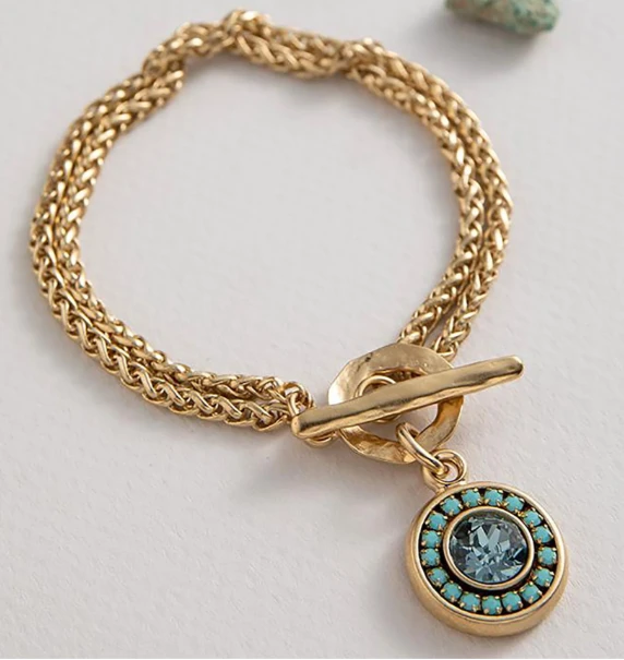 צמיד עדין ויוקרתי, מצופה זהב 24K, מעוטר בתליון עגול ומשובץ בקריסטלים.