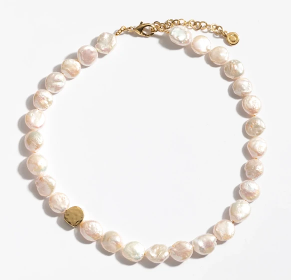 צמיד פנינים שטוחות ואלמנט זהב, בעיצוב אלגנטי ומדויק ללוק מחמיא וחגיגי.