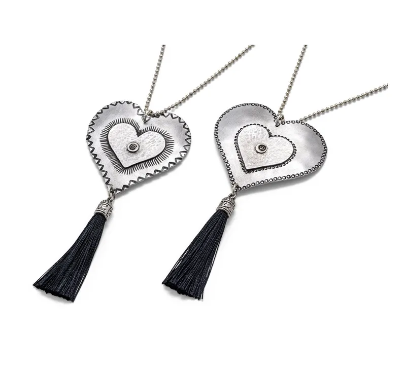 שרשרת לב כפול בעבודת יד, שילוב של אלומיניום מרוקע עם טקסטורה ייחודית ואלמנט גדיל שחור להשלמת המראה.
