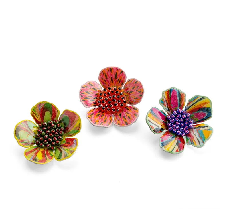סיכת פרח בעיצוב איריס אוליבר, עשויה מחומרים צבעוניים בטכניקה ייחודית.