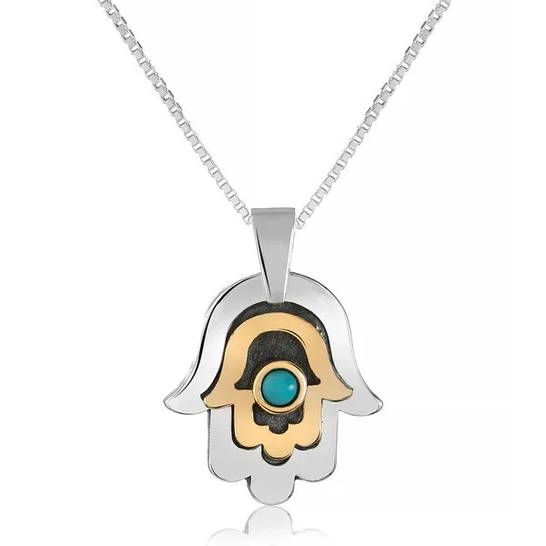 תליון חמסה מכסף בשילוב זהב 9K עם אבן טורקיז טבעית – כוח והגנה בסגנון ייחודי