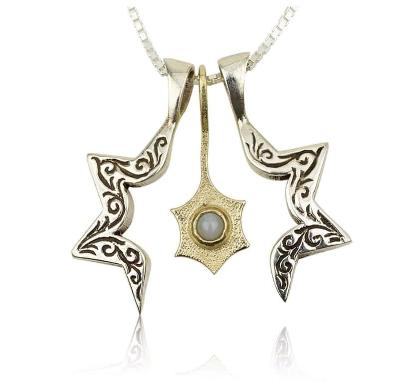 תליון מגן דוד מ-ר-ה-י-ב , מורכב משלושה תליונים נפרדים , כסף וזהב 14K, משובץ אבן קריסובריל (עין החתול) ,  3 מ"מ