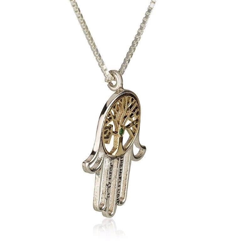 שרשרת "חמסה עץ החיים" מיוצרת בעבודת יד מזהב 14K וכסף 925 ומשובצת באבן אמרלד (לבחירה) 1.5 מ"מ