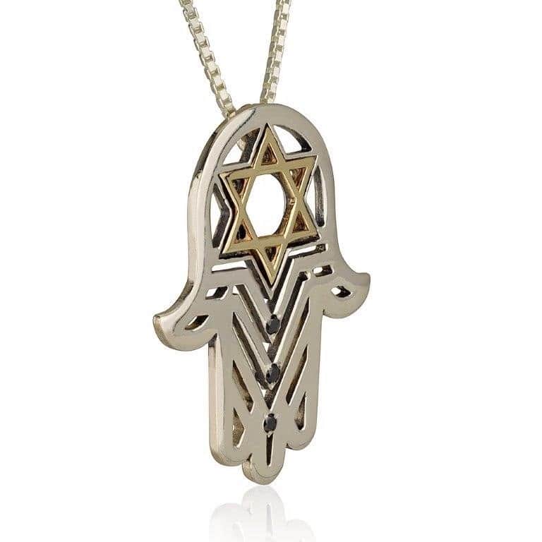 תליון חמסה "יד שרה" משולב מגן דוד זהב 14K, כסף 925 משובצת 3 יהלומים שחורים 1.3 מ"מ
