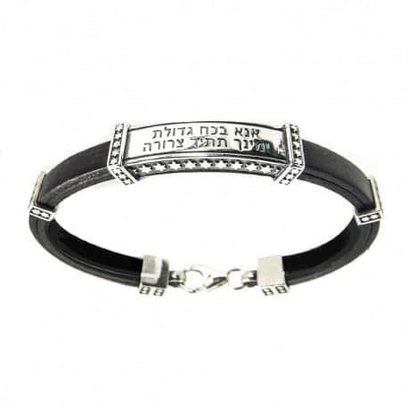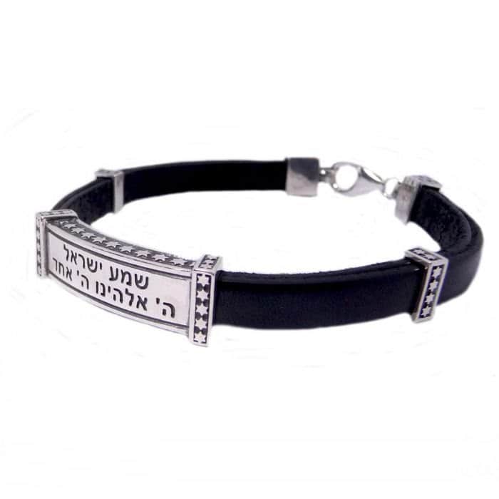 צמיד עור איכותי כפול , בשילוב עיטורי מגן דוד , "שמע ישראל" , כסף