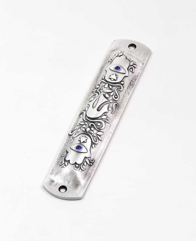 במרכז המזוזה תבליט האות "ש", בראשה ובתחתיה תבליטי חמסות שעל כל אחץ מהן מגן דוד ועין נגד עין רעה, משובצות באבני קריסטל כחולות.