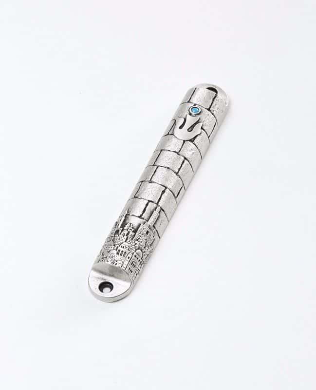 מזוזה מעוטרת באיור של ירושלים והכותל הערבי השוכן במרכזה.