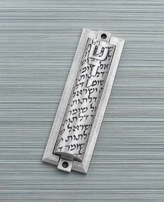 על המזוזה כיתוב החוזר על עצמו "שומר דלתות ישראל" והיא מתאימה לקלף באורך 12 ס"מ.