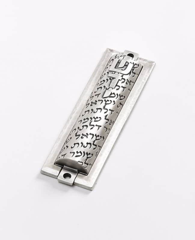 בית מזוזה זה מצופה כסף טהור ומורכב משני חלקים, האחד מכסה את הקלף והשני מגן עליו מפני המשקוף.