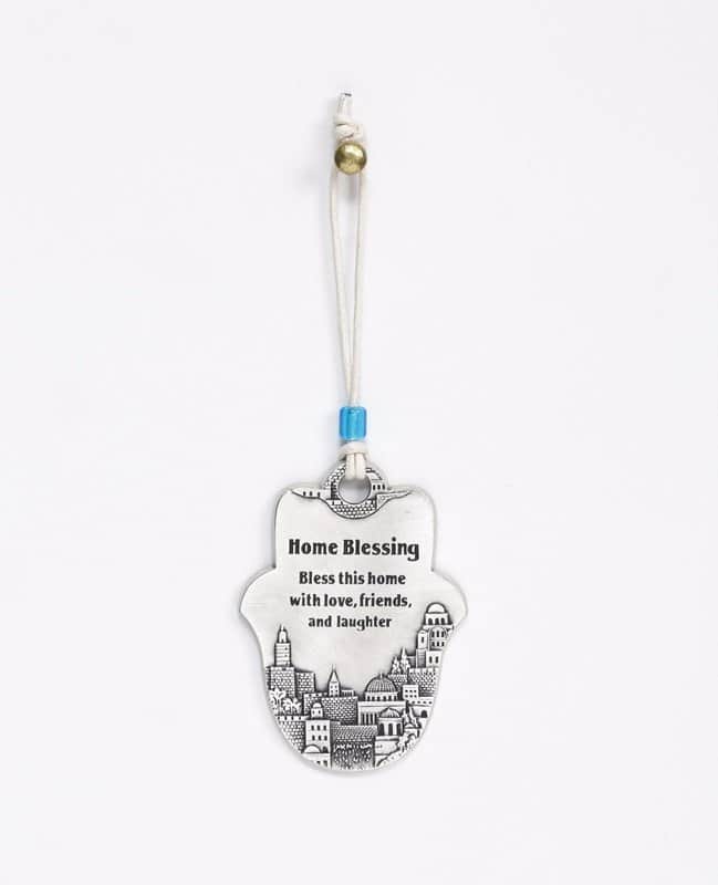 מתלה חמסה ברכת הבית בשפה האנגלית מצופה כסף טהור ומעוטר בתבליט ירושלים.