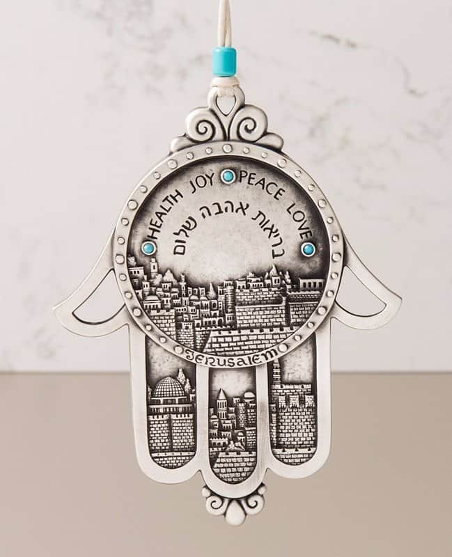 מתלה חמסה מצופה כסף טהור, מעוטרת בגוף החמסה ובשלוש האצבעות האמצעיות בתבליט מראות ירושלים היפה.