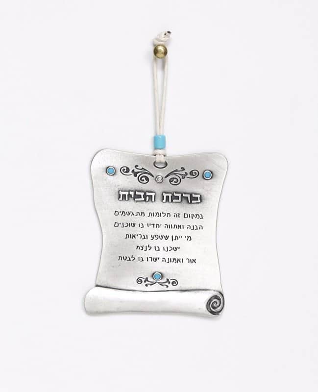 גרסה עכשווית לברכת הבית המסורתית, כתובה בחרוזים ושופעת איחולים, היא מוטבעת בחריטה ידנית על קלף מגילה מצופה כסף טהור, מעוטר באלמנטים ציוריים ומשובץ אבני טורקיז.