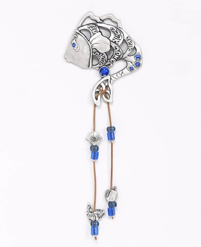 מזנב הדג משתלשלות שתי רצועות מחוט דמוי עור המעוטרות במוטיבים של דג, תפוח וחמסה, לצד חרוזים בצבע כחול.