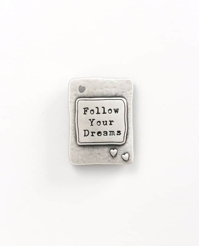 מגנט מלבני עם כיתוב באנגלית "Follow Your Dreams" ושלושה לבבות בעיצוב מודרני.