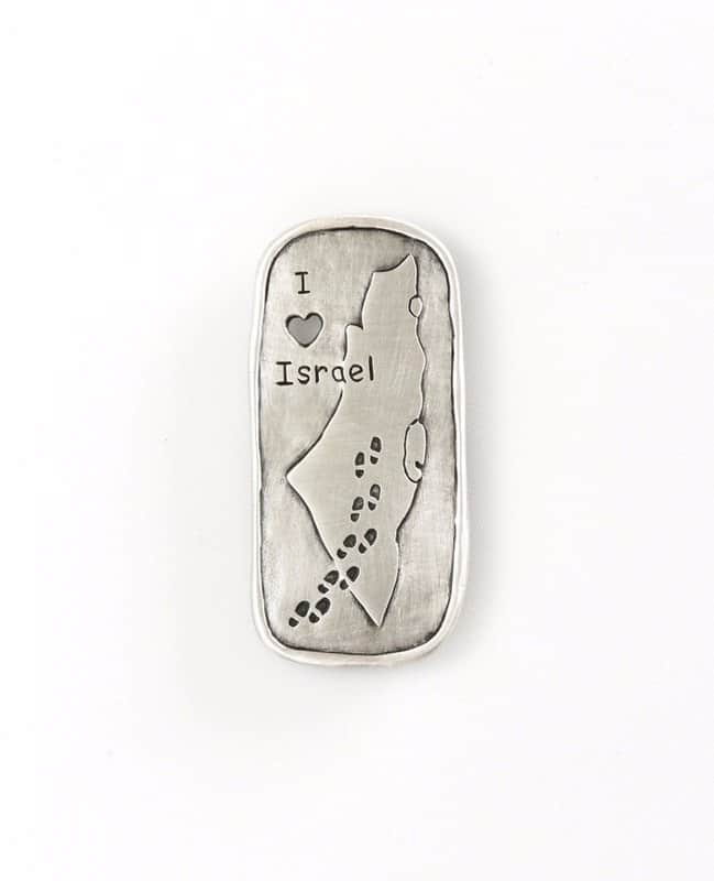 מגנט מלבני מצופה כסף טהור ועליו מפת ארץ ישראל והכיתוב I Love Israel.