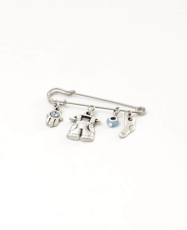 תליון עגלה בצורת אוברול מתוק מצופה כסף טהור ואליו מצורפים חמסה עם אבן כחולה, גרב קטנטנה וחרוז כחלחל.