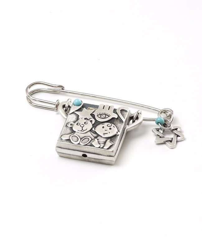 תליון עגלה עם ספר תהילים קטן השמור במעין קופסא מעוטרת בדובי ותינוק/ת ומצד השני מופיעה הברכה: