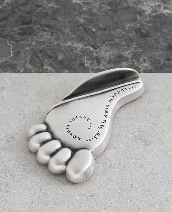 מעמד כרטיסי ביקור בצורת כף רגל מצופה כסף טהור ועליה הכיתוב "להתחלות חדשות ברגל ימין, לשגשוג והצלחה".