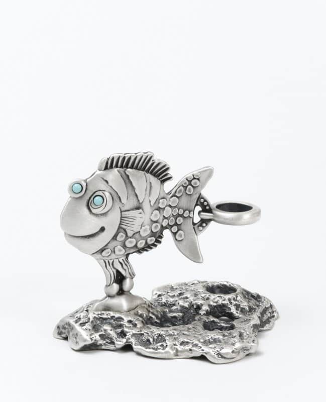מוטיב הדג, המסמל שפע ושגשוג, מצופה כסף טהור ומשובץ אבני טורקיז, על סלע המשמש כמעמד דקורטיבי לעט.
