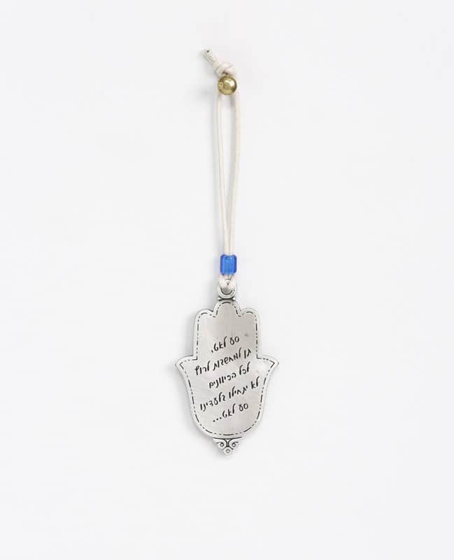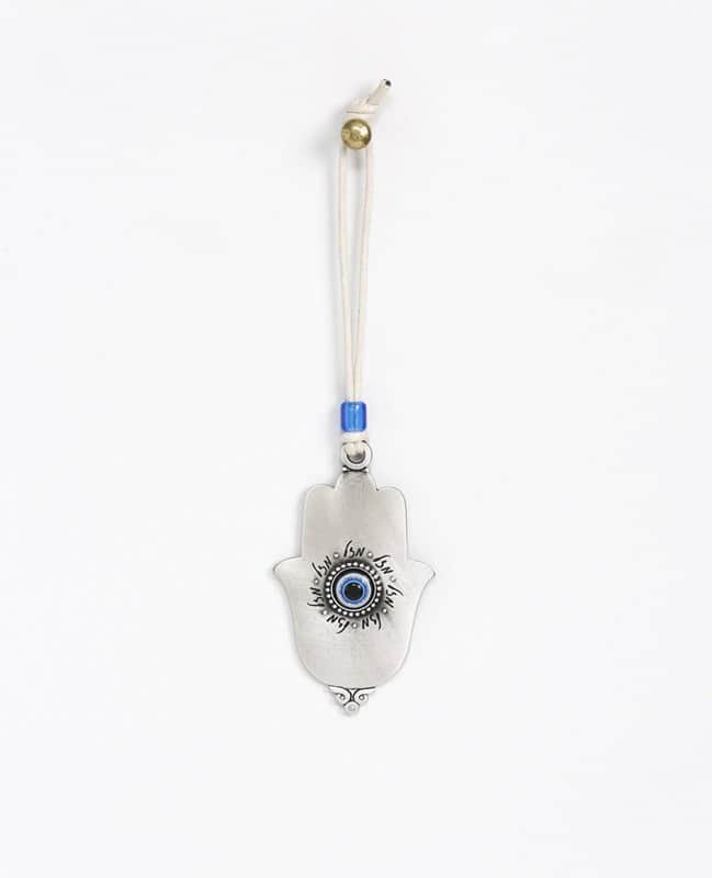 המתלה מצופה כסף טהור ותלוי על חוט חזק דמוי עור בצבע טבעי, המעוטר בחרוז בצבע כחול.