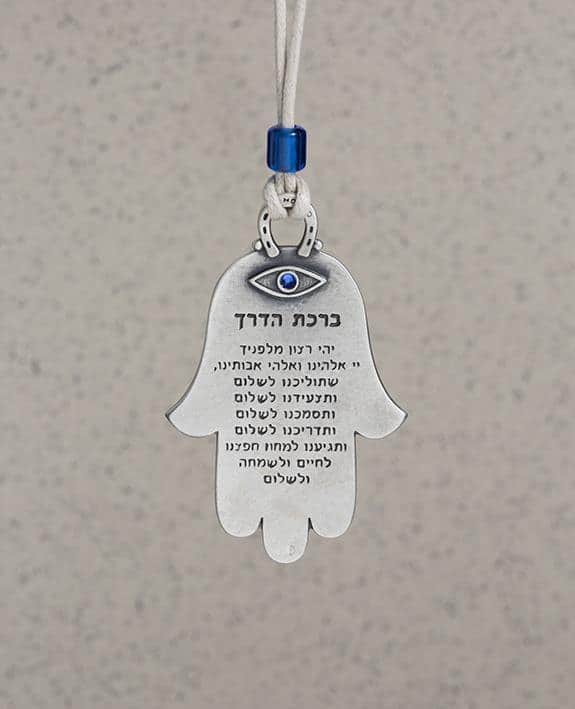בצדה השני של החמסה מוטבעת עיין משובצת באבן בצבע כחול ומתחתיה כתובה תפילת הדרך.