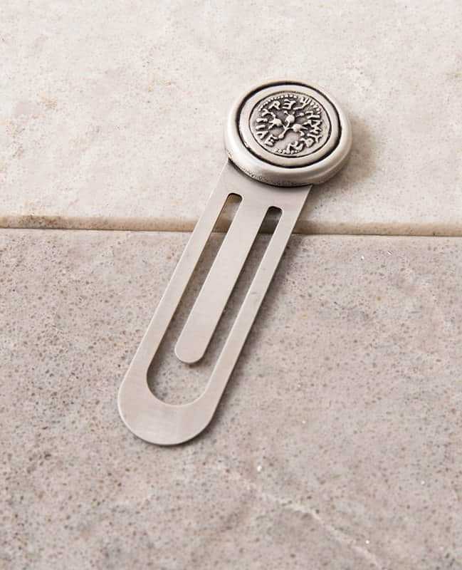 סימנייה מצופה כסף טהור ובראשה תבליט מטבע עתיק.